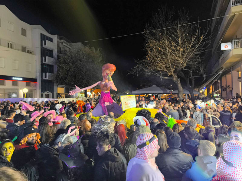 Η καρναβαλική παρέλαση ολοκληρώθηκε με τη ρίψη σοκοφρετών, χαρίζοντας χαμόγελα σε μικρούς και μεγάλους, ενώ ακολούθησε μεγάλη συναυλία με τον Ηλία Βρεττό, που ξεσήκωσε το κοινό.