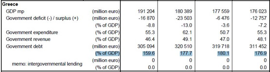Συγκεκριμένα, το δημόσιο χρέος διαμορφώθηκε το προηγούμενο έτος στο 176,9% του ΑΕΠ δηλαδή στα 311,5 δισ. ευρώ από το 180% επί του ΑΕΠ (319,7 δισ. ευρώ) το 2014.
