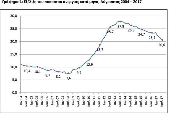 Οπως αναφέρει, το εποχικά διορθωμένο ποσοστό ανεργίας διαμορφώθηκε στο 20,6% τον Αύγουστο, έναντι του αναθεωρημένου προς τα άνω 23,4% τον Αύγουστο του 2016 και του αναθεωρημένου προς τα κάτω 20,9% για τον Ιούλιο του 2017.