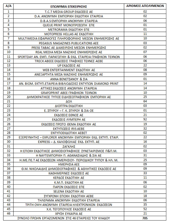 Πίνακας 1: Κατάλογος επιχειρήσεων από τις οποίες προέρχονται οι 705 πρώην εργαζόμενοι του προγράμματος