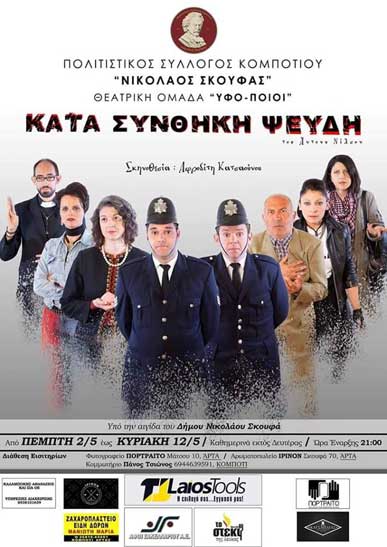Την ξεκαρδιστική φάρσα Κατά συνθήκη ψεύδη, του Άντονι Νίλσον, σε σκηνοθεσία Αφροδίτης Κατσαούνου, παρουσιάζει η Θεατρική Ομάδα Υφοποιοί, του Πολιτιστικού Συλλόγου Κομποτίου. Η παράσταση θα πραγματοποιηθεί στην Αίθουσα Πολλαπλών Χρήσεων Κομποτίου, από Πέμπτη 2 έως Κυριακή 5 Μαΐου 2019 και από Τρίτη 7 έως Κυριακή 12 Μαΐου 2019 και ώρα: 9.00 μ.μ.