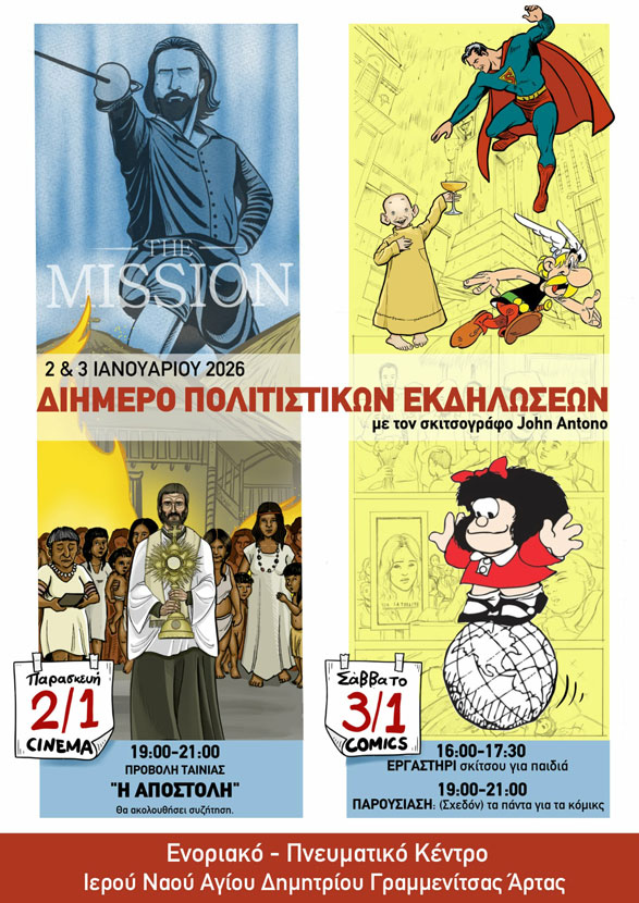 • Παρασκευή 2/01/2026, 19:00: Παρουσίαση, προβολή και συζήτηση της ταινίας «Η Αποστολή» (1986, σκηνοθεσία Ρολάν Ζοφέ, με τους Ρόμπερτ Ντε Νίρο και Τζέρεμι Άιρονς), η οποία έχει τιμηθεί με Όσκαρ Καλύτερης Φωτογραφίας, Χρυσό Φοίνικα στις Κάννες, βραβεία BAFTA και Χρυσές Σφαίρες. Η μουσική της υπογράφεται από τον Ένιο Μορικόνε.