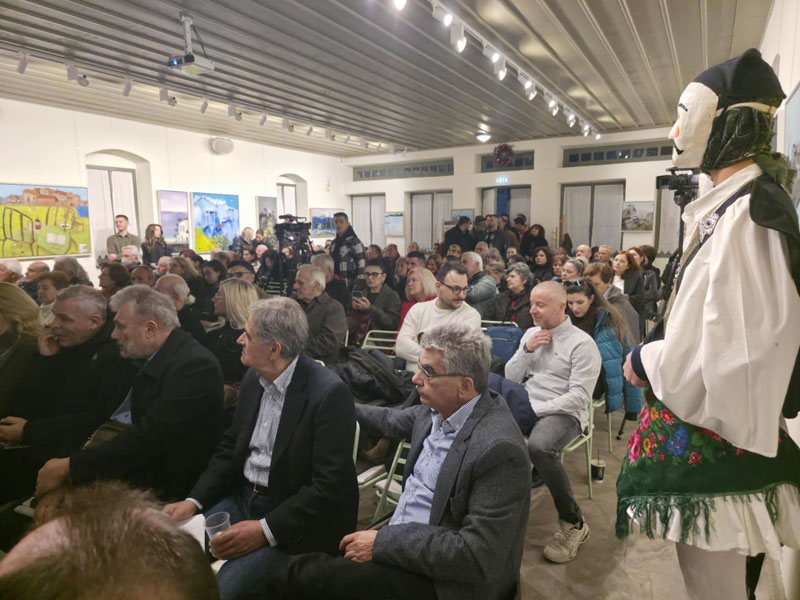 Παράλληλα, οι «πρωταγωνιστές» χορευτές του Γαϊτανακίου, με τις γνήσιες παραδοσιακές φορεσιές και τις χαρακτηριστικές προσωπίδες τους, έδωσαν ζωντανή υπόσταση στο έθιμο μέσα στην αίθουσα, μετατρέποντας την παρουσίαση σε βιωματική εμπειρία.