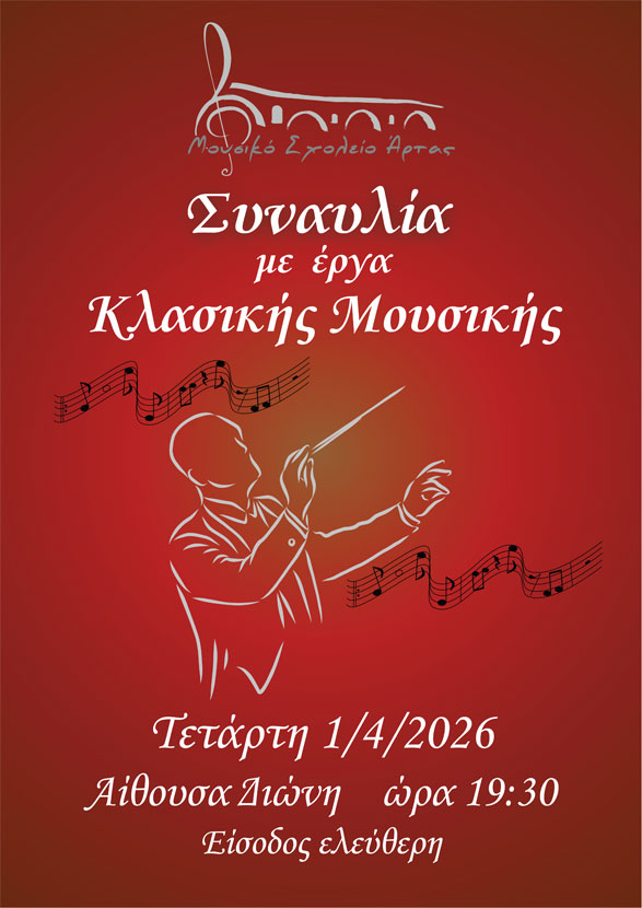 Την Τετάρτη 1η Απριλίου το Μουσικό Σχολείο Άρτας Θα πραγματοποιήσει την, καθιερωμένη πλέον, συναυλία κλασικής μουσικής.