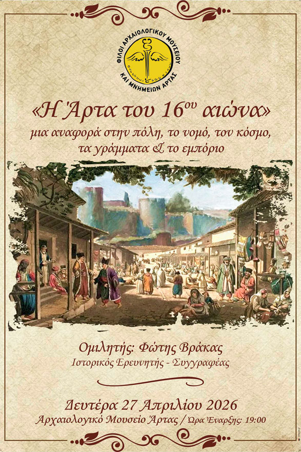 Ο Σύλλογος «Φίλοι Αρχαιολογικού Μουσείου και Μνημείων Άρτας» σας προσκαλεί στην εκδήλωση που διοργανώνει στο Αρχαιολογικό Μουσείο Άρτας, τη Δευτέρα 27 Απριλίου 2026 και ώρα 19:00, με ομιλητή τον κ. Φώτη Βράκα, ιστορικό ερευνητή και συγγραφέα, ο οποίος θα παρουσιάσει το θέμα: «Η Άρτα του 16ου αιώνα. Μια αναφορά στην πόλη, το νομό, τον κόσμο, τα γράμματα και το εμπόριο».